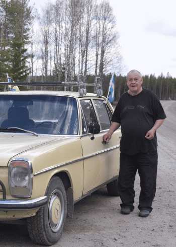 Bild på Tommy som stolt visar upp sina veteranbilar. Fotograf: Birgitta Lindvall Wiik.